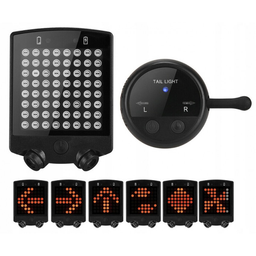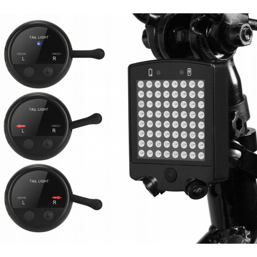 Zadné svetlo na bicykel so smerovými svetlami a bezdrôtovým diaľkovým ovládaním. Diaľkové ovládanie, ktoré môžete pripevniť na riadidlá, umožňuje prepínanie medzi ľavým a pravým smerovým svetlom. Svetlo je napájané nabíjateľnou 3,7V 650 mAh batériou, ktorú je možné nabíjať cez USB kábel.