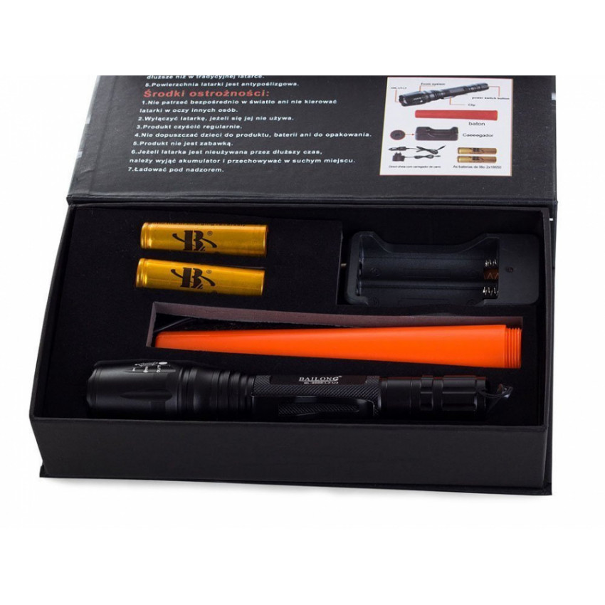 Taktická baterka bola navrhnutá pre taktické použitie. Môžu ju využívať uniformované služby, armáda, poľovníci, milovníci prírody alebo na domáce použitie. Môže byť použitá ako násada na airsoft / paintball zbraň. Vďaka použitiu tesniaceho systému a veľmi dobrého uchytenia prvkov je baterka odolná proti silnému dažďu, vlhkosti a bahnu. Svietidlo bolo vybavené najnovšou polovodičovou diódou XM-L3-U3. Toto je najsilnejšia LED dióda, ktorá môže oslepiť každého. Životnosť diódy dosahuje až 100 000 hodín. Na napájanie baterky sa použili vysokokvalitné lítium-iónové 18650 batérie / články, čo umožňuje, aby baterka vydržala dlhú dobu. Okrem toho sa baterka nabíja pomocou USB kábla. Celá súprava je zabalená v elegantnej a pevnej krabici, v ktorej má každý prvok svoje miesto, čo z nej robí ideálny darček.