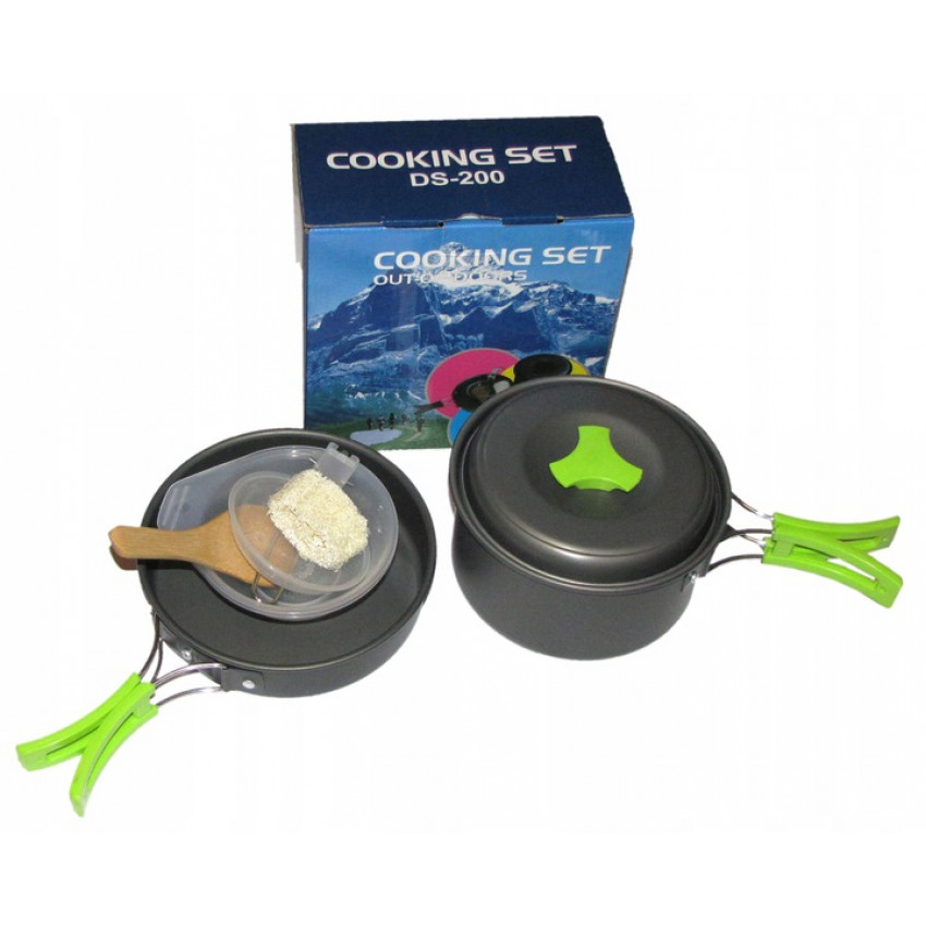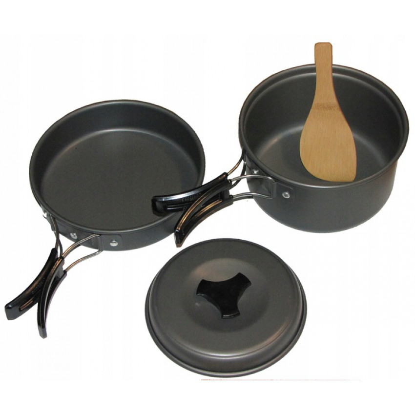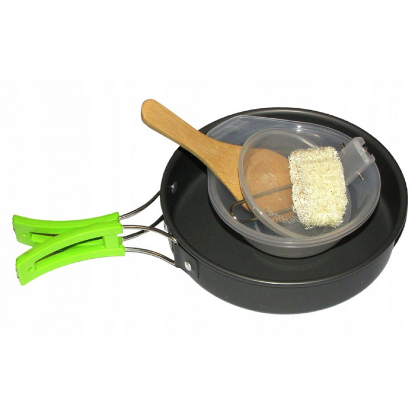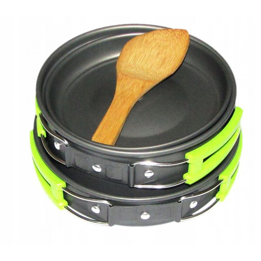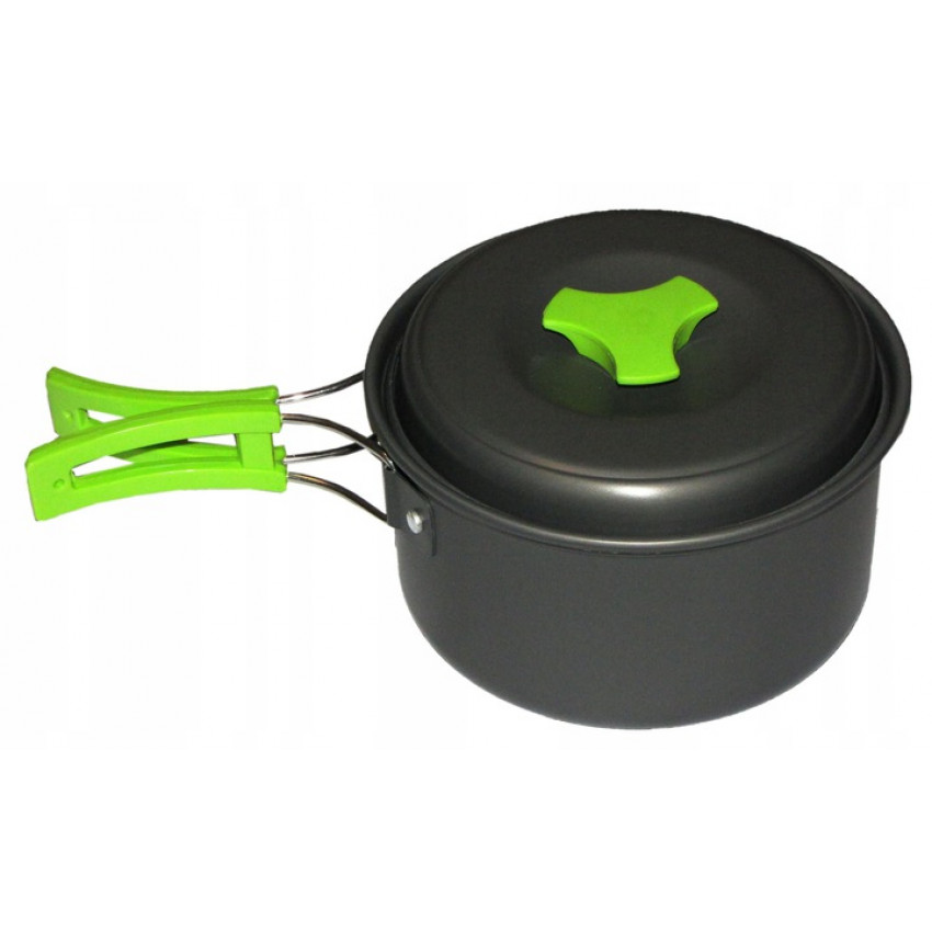 Moderná turistická sada. Odporúča sa všetkým outdoorovým nadšencom, horolezcom, survivalistom a turistom. Extrémne ľahká a šikovná, kompaktné rozmery vám umožnia zbaliť sadu aj do malého batohu. Produkty sú vyrobené z ľahkej hliníkovej zliatiny podrobenej procesu tvrdej oxidácie (černenie). Hliník výborne vedie teplo, varenie jedla či čaju na poli pomocou slabého zdroja tepla nebude už problém. Hladký, nepriľnavý povrch, veľmi ľahko sa čistí. Riad je vybavený výklopnými rúčkami proti pripáleniu z ebonitového materiálu v čiernej farbe so zelenými prvkami.