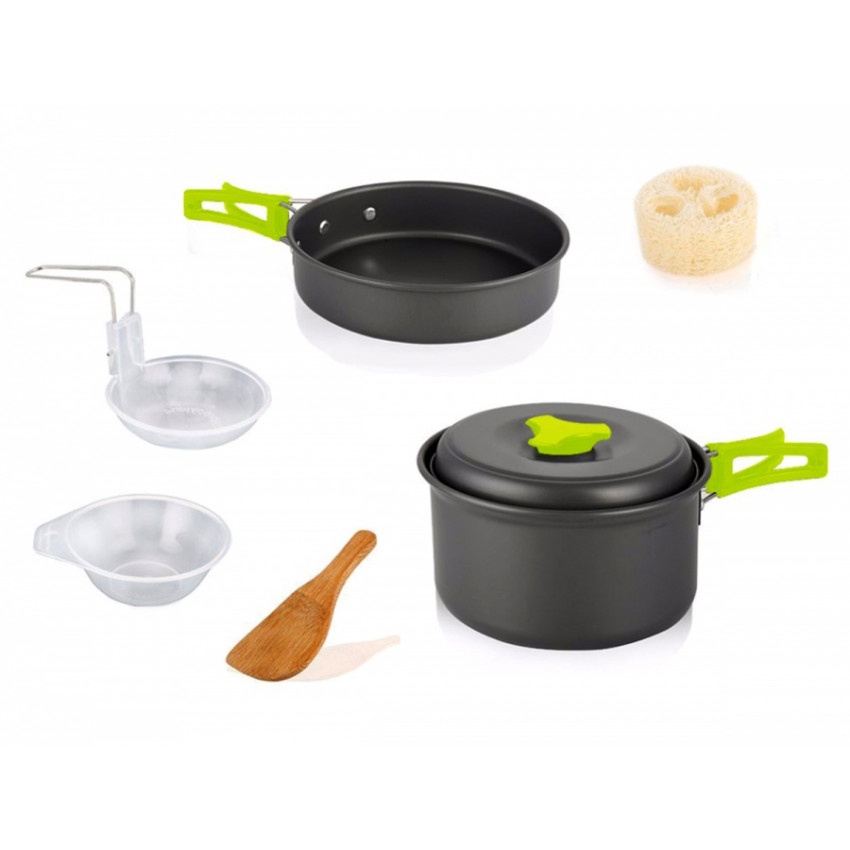 Kompletná sada turistického riadu pozostávajúca až z 9 prvkov. Ideálne na kempovanie a výlety. Hrniec, panvica a naberačka majú zložené rukoväte, vďaka čomu sa dajú ľahko skladať a skladovať. Sú vyrobené z hliníka (hrnec, panvica a pokrievka), ktorý zaisťuje vysokú odolnosť a zabraňuje prilepeniu potravín. Možnosť zloženia a pohodlného uloženia v priloženej taške so sťahovacou šnúrkou.