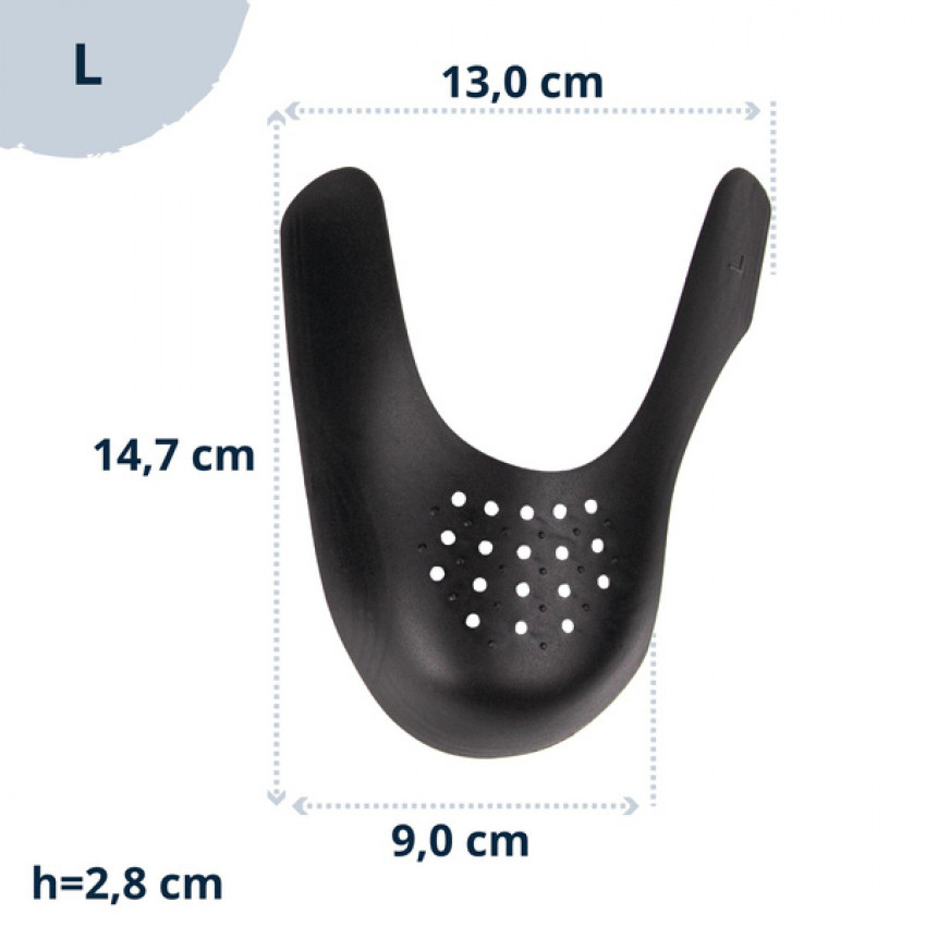 Výstuhy sú dostupné v dvoch veľkostiach: M pre veľkosti topánok 36-41 a L pre veľkosti 42-49. Odporúčame používať v topánkach o polovicu väčšej veľkosti, aby sa predišlo nepohodliu.