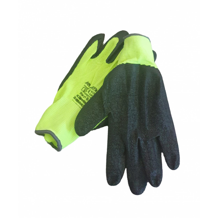 Rukavice sú v neónovej a čiernej farbe, čo zvyšuje ich viditeľnosť pri práci.