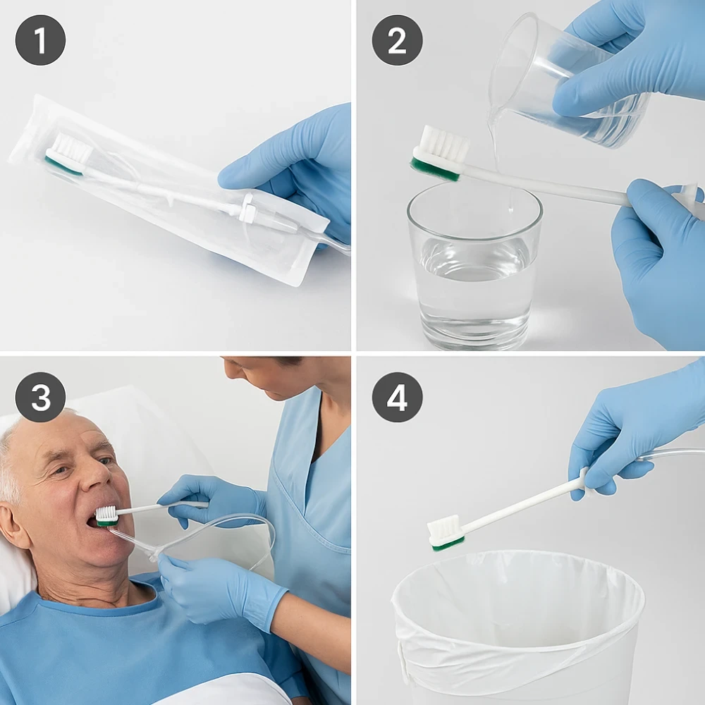 Jednorazová zubná kefka s odsávačkou spája funkcie čistenia, oplachovania a sania. Vďaka mäkkým štetinám je šetrná k ďasnám a vhodná pre pacientov s obmedzenou mobilitou.